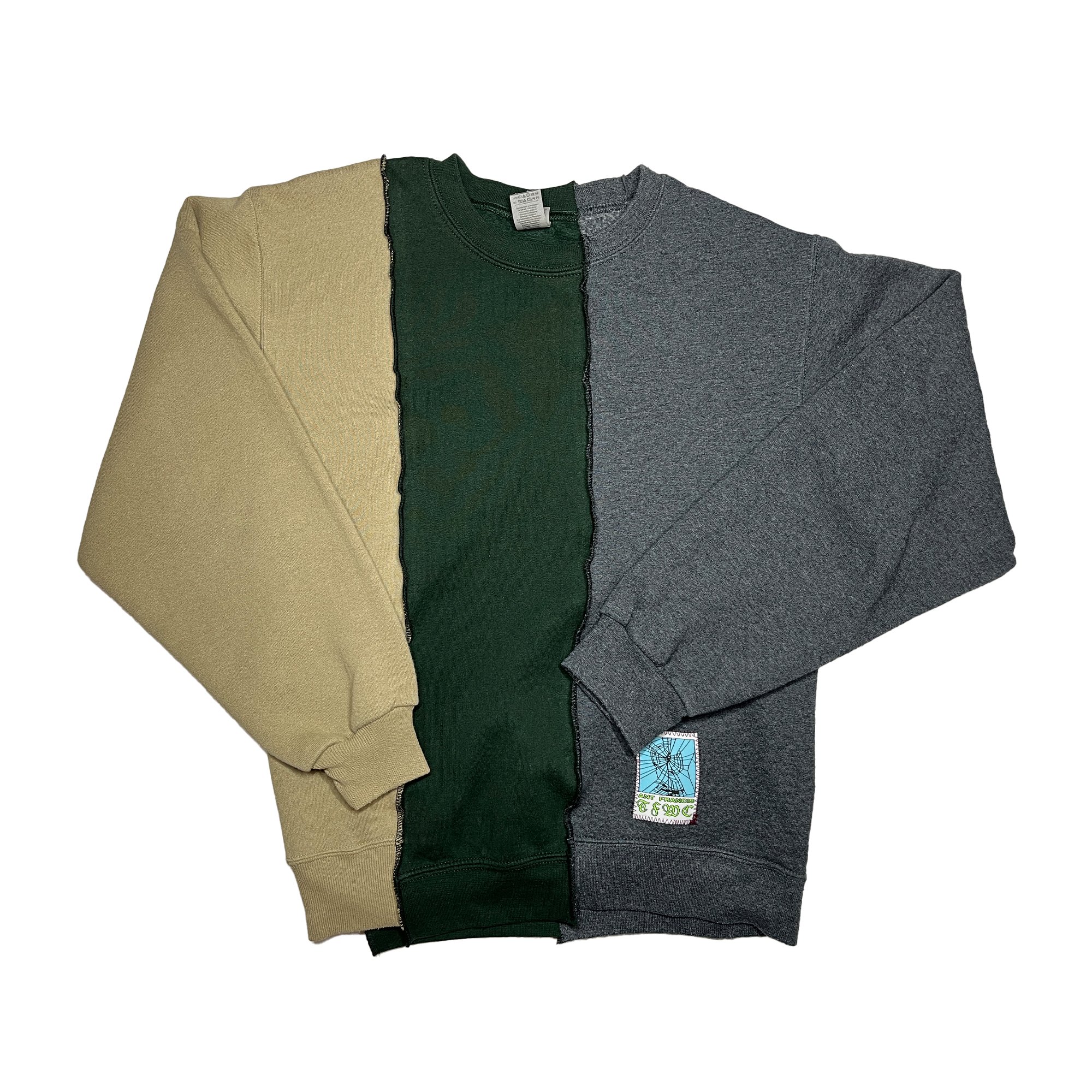 This is the cumulation of a few sweatshirts of similar size/proportions. The result is a 1:1 garment that tells many stories. There are a few of each design. Siblings, perhaps. Buy one, maybe you'll find its sibling in the wild. Maybe you'll make a new friend. Buy two, one for you and an existing friend. Whatever you do, buy one.. if you like it.